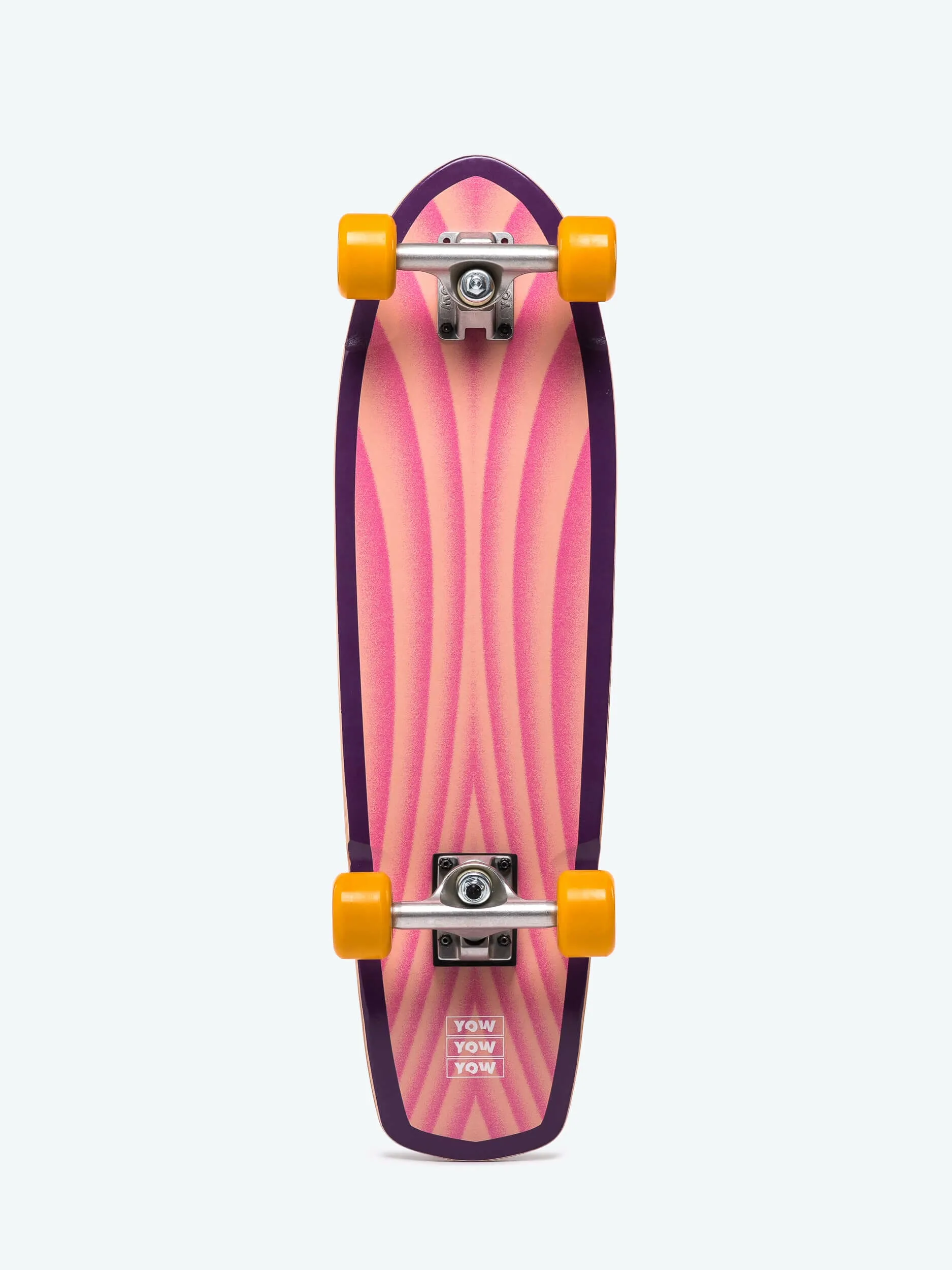Compact surf cruiser with flat concave and tail rocker. Lightweight daily commuter with wheel wells for anti-wheelbite. Legasee trucks for surfy carving without a spring system.